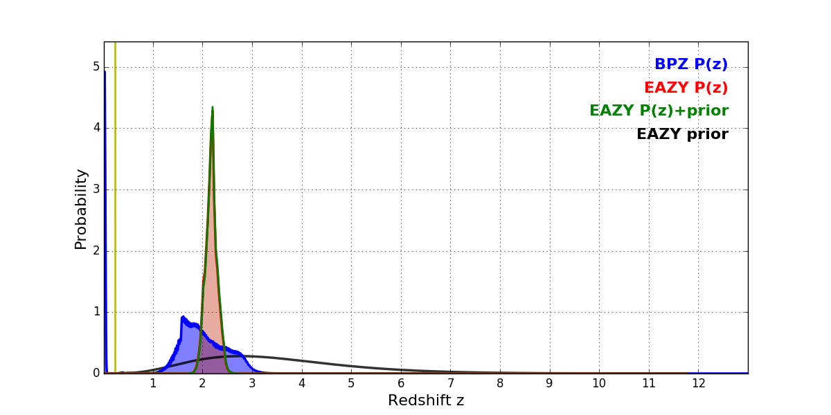 In P(z) plots: Yellow lines mark the cluster redshift z = 0.228,