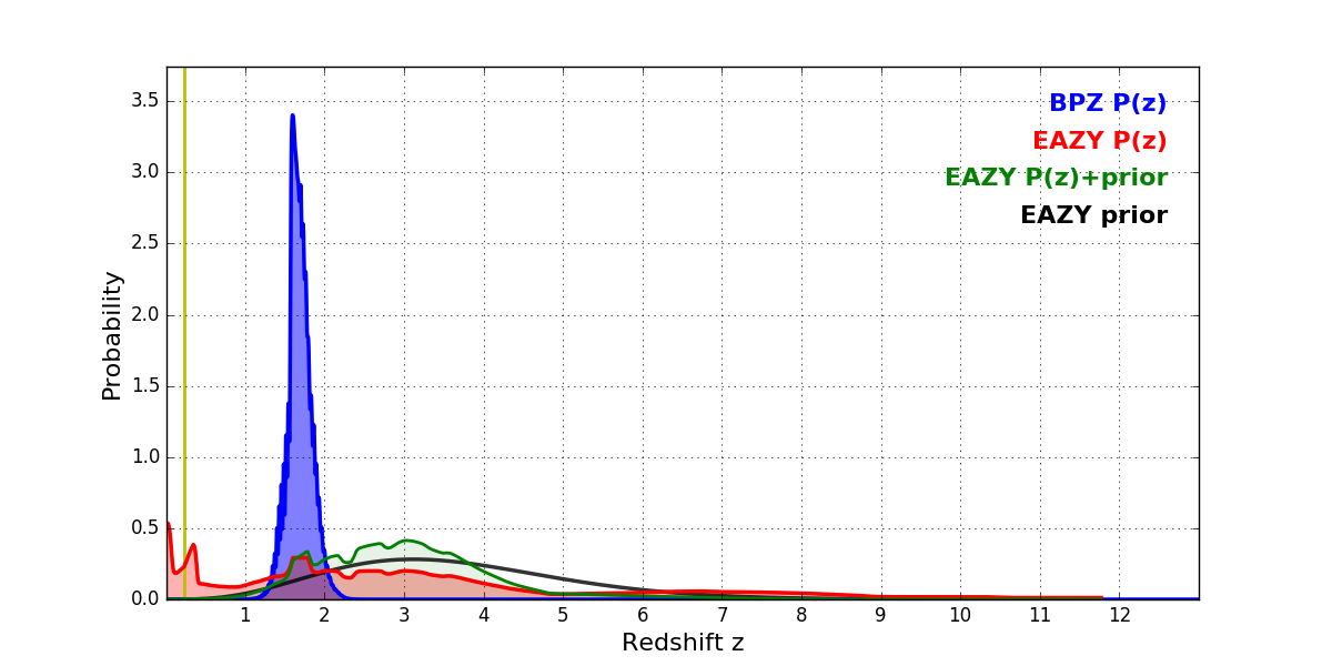 In P(z) plots: Yellow lines mark the cluster redshift z = 0.228,