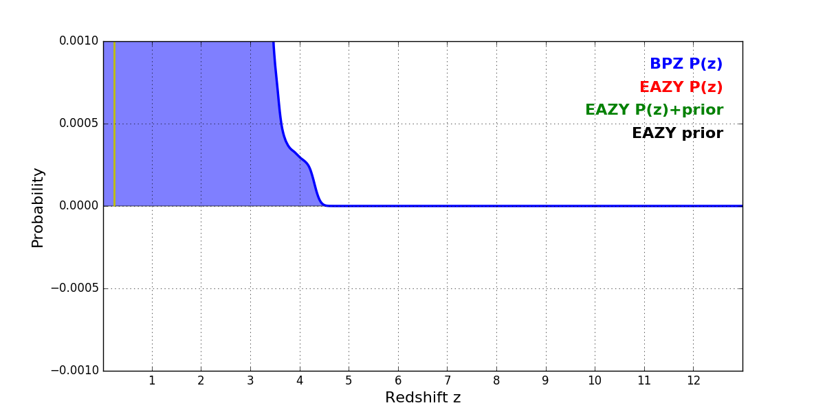 In P(z) plots: Yellow lines mark the cluster redshift z = 0.228,