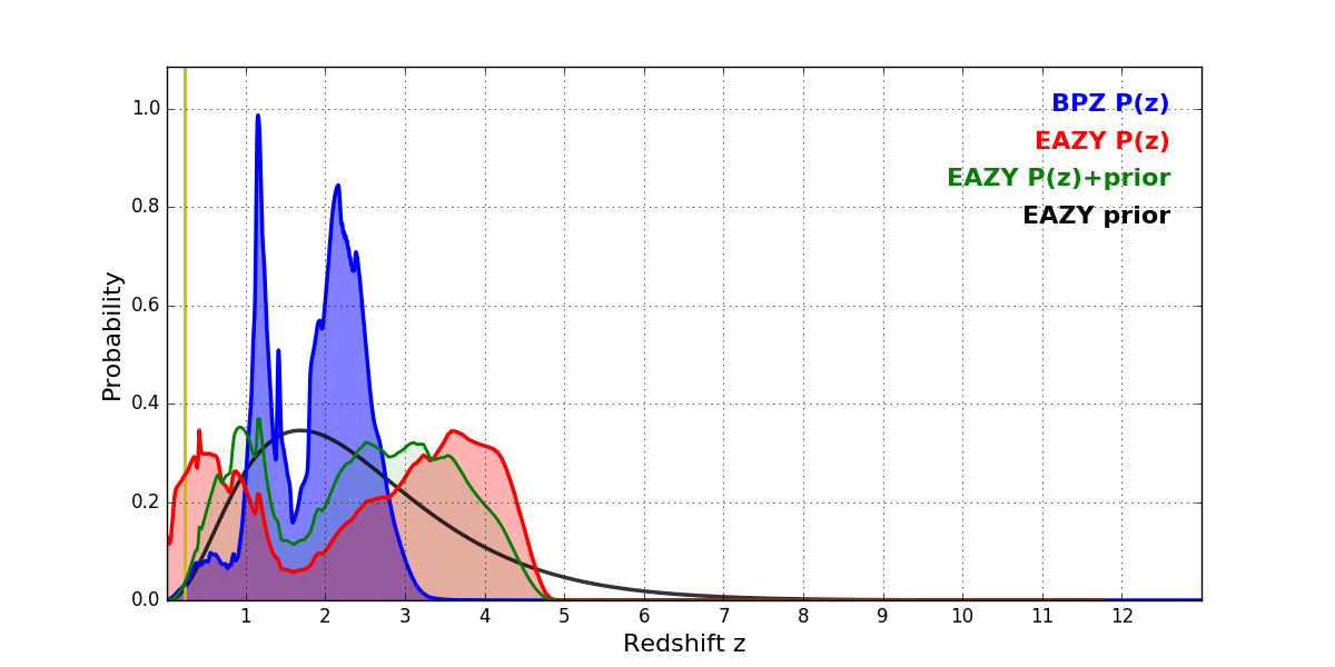 In P(z) plots: Yellow lines mark the cluster redshift z = 0.228,