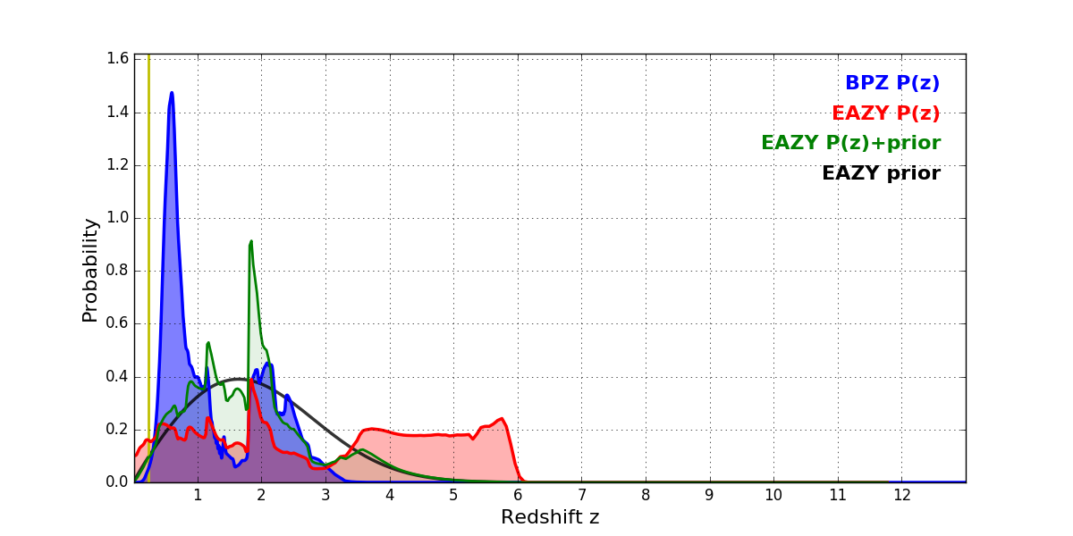 In P(z) plots: Yellow lines mark the cluster redshift z = 0.228,