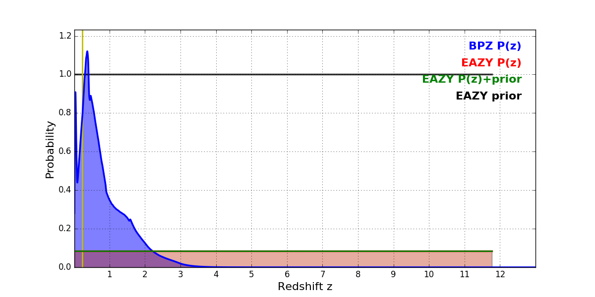 In P(z) plots: Yellow lines mark the cluster redshift z = 0.228,