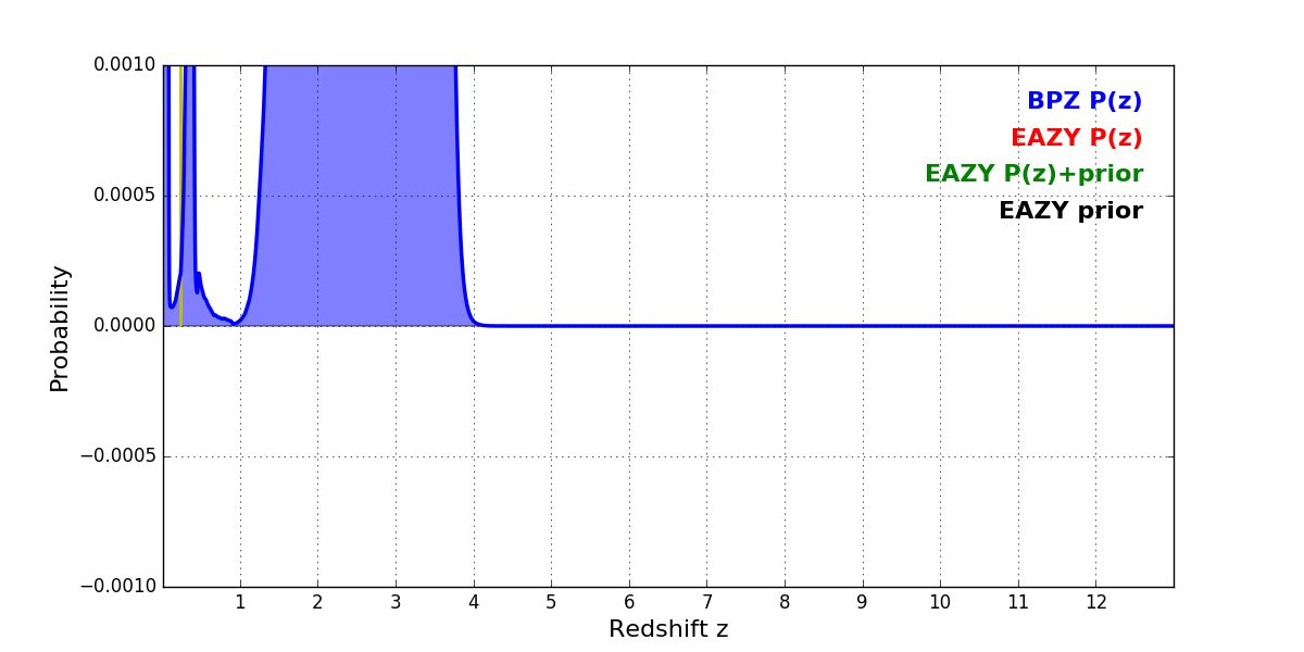 In P(z) plots: Yellow lines mark the cluster redshift z = 0.228,