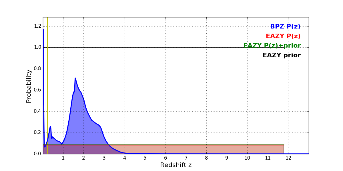 In P(z) plots: Yellow lines mark the cluster redshift z = 0.228,