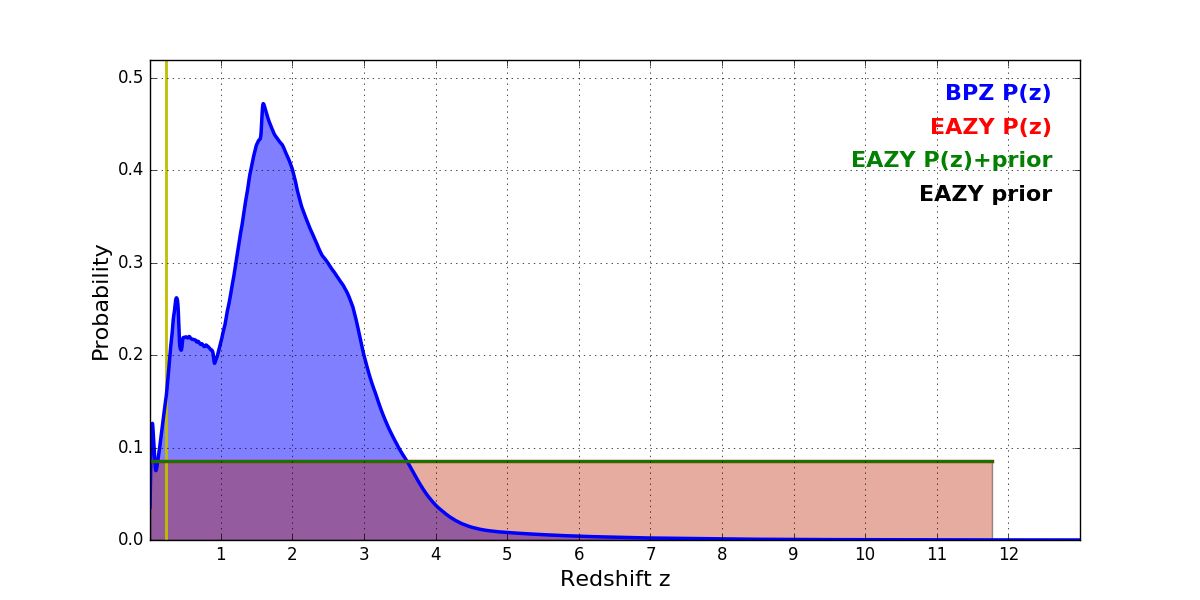In P(z) plots: Yellow lines mark the cluster redshift z = 0.228,