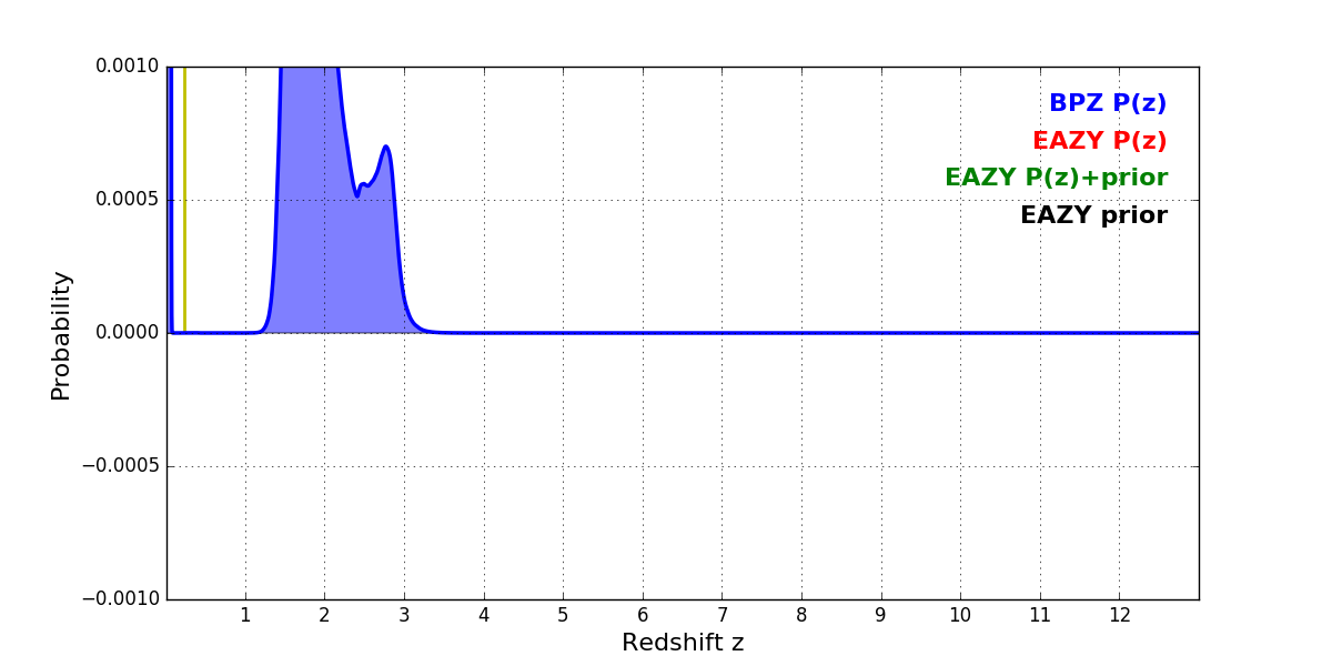 In P(z) plots: Yellow lines mark the cluster redshift z = 0.228,