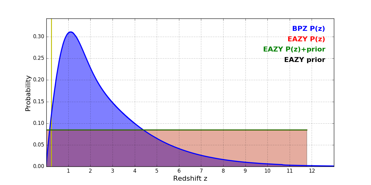 In P(z) plots: Yellow lines mark the cluster redshift z = 0.228,