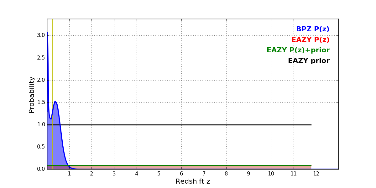In P(z) plots: Yellow lines mark the cluster redshift z = 0.228,