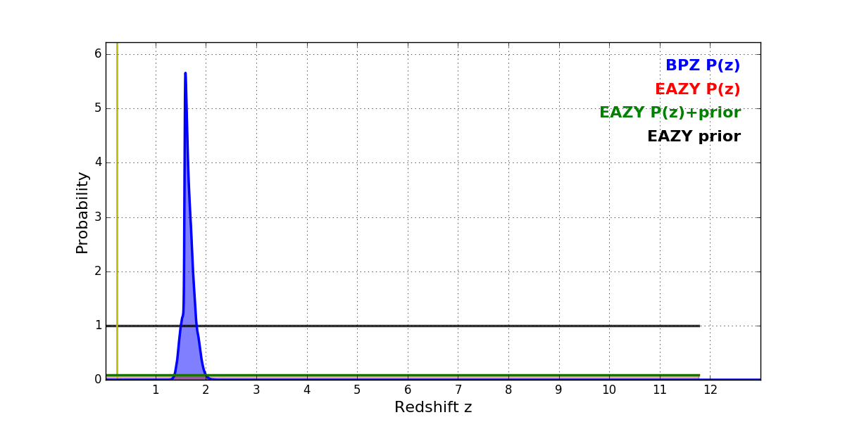 In P(z) plots: Yellow lines mark the cluster redshift z = 0.228,