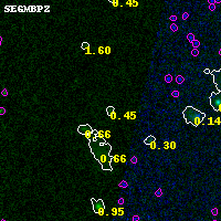 Object #2129   x,y = (963, 3381)   RA, Dec = (07:23:41.592, -73:26:22.20) = (110.92330, -73.43950)   BPZ = 0.451 [0.175--3.977]   type = 8.10 (SB1_B10 - SB2_B10)   stellarity = 0.93   chisq2 = 0.00   ODDS = 0.09   z_cluster = 0.390