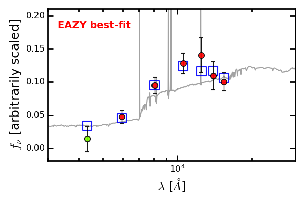 Object #1272   x,y = (2107, 1793)   RA, Dec = (07:23:25.536, -73:27:57.60) = (110.85640, -73.46600)   BPZ = 0.814 [0.300--4.500]   type = 9.00 (SB2_B10)   stellarity = 0.00   chisq2 = 1.38   ODDS = 0.22   z_cluster = 0.390