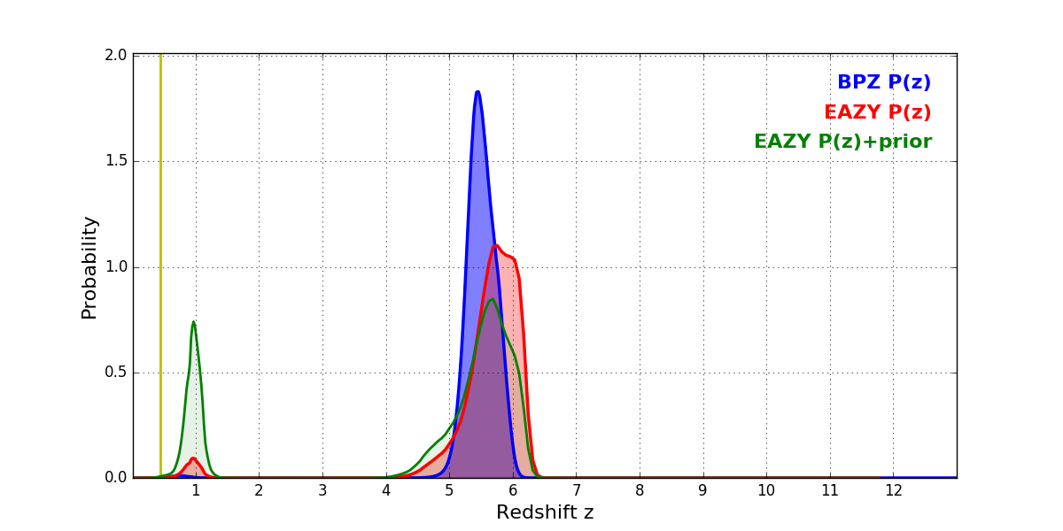 In P(z) plots: Yellow lines mark the cluster redshift z = 0.438,