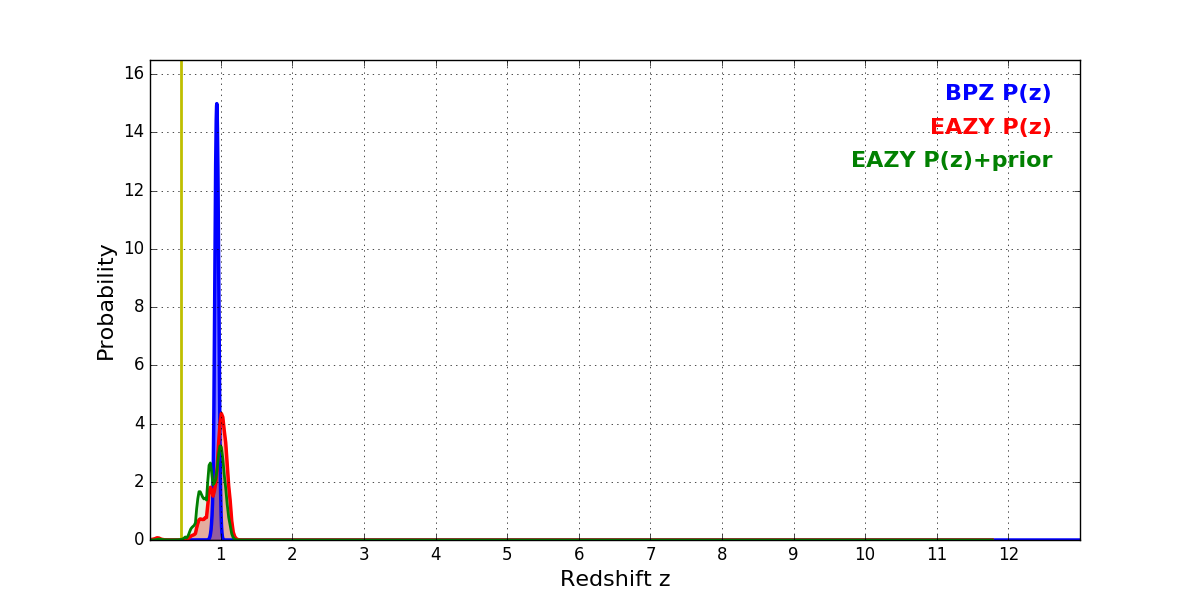 In P(z) plots: Yellow lines mark the cluster redshift z = 0.438,