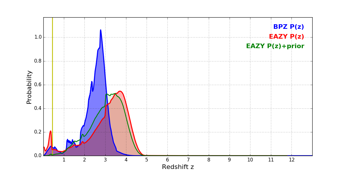 In P(z) plots: Yellow lines mark the cluster redshift z = 0.438,