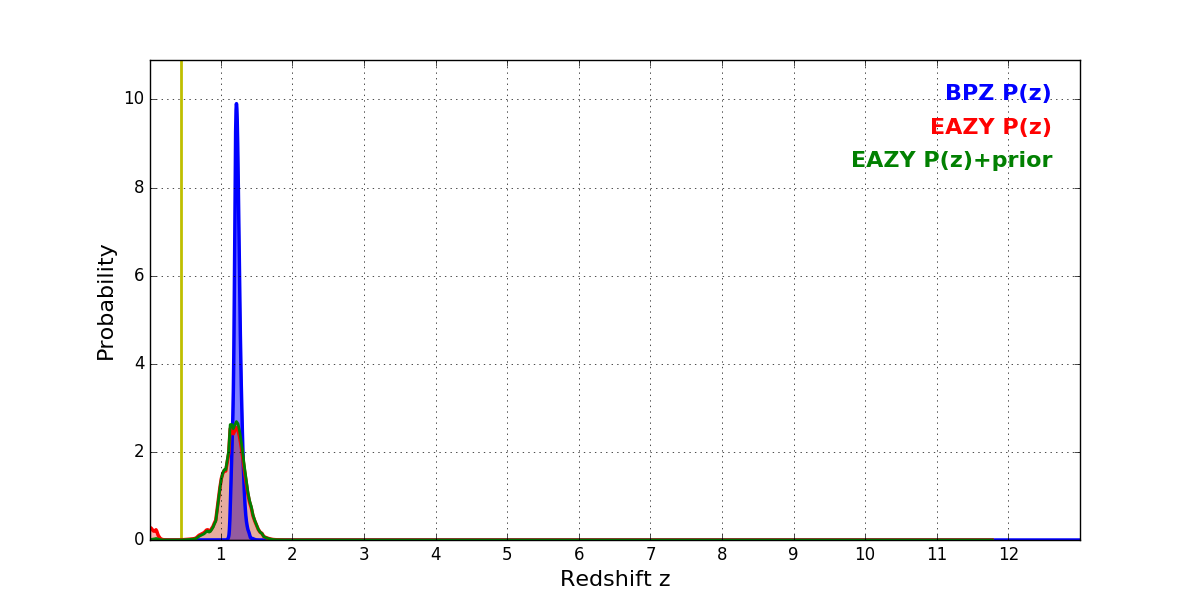 In P(z) plots: Yellow lines mark the cluster redshift z = 0.438,