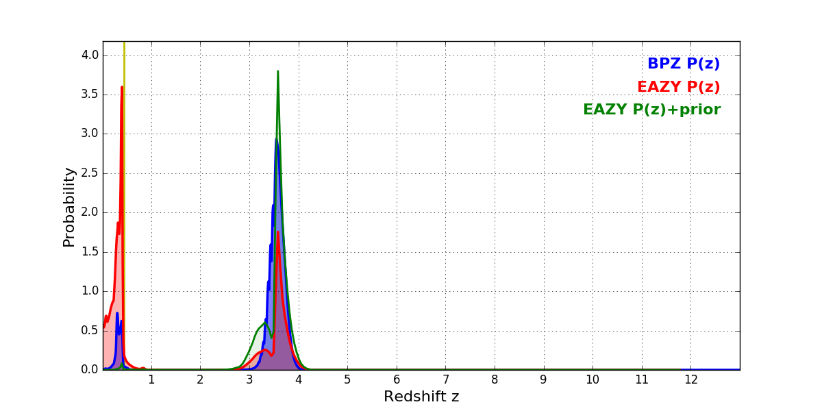 In P(z) plots: Yellow lines mark the cluster redshift z = 0.438,