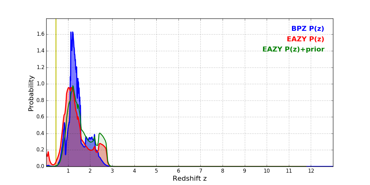 In P(z) plots: Yellow lines mark the cluster redshift z = 0.438,