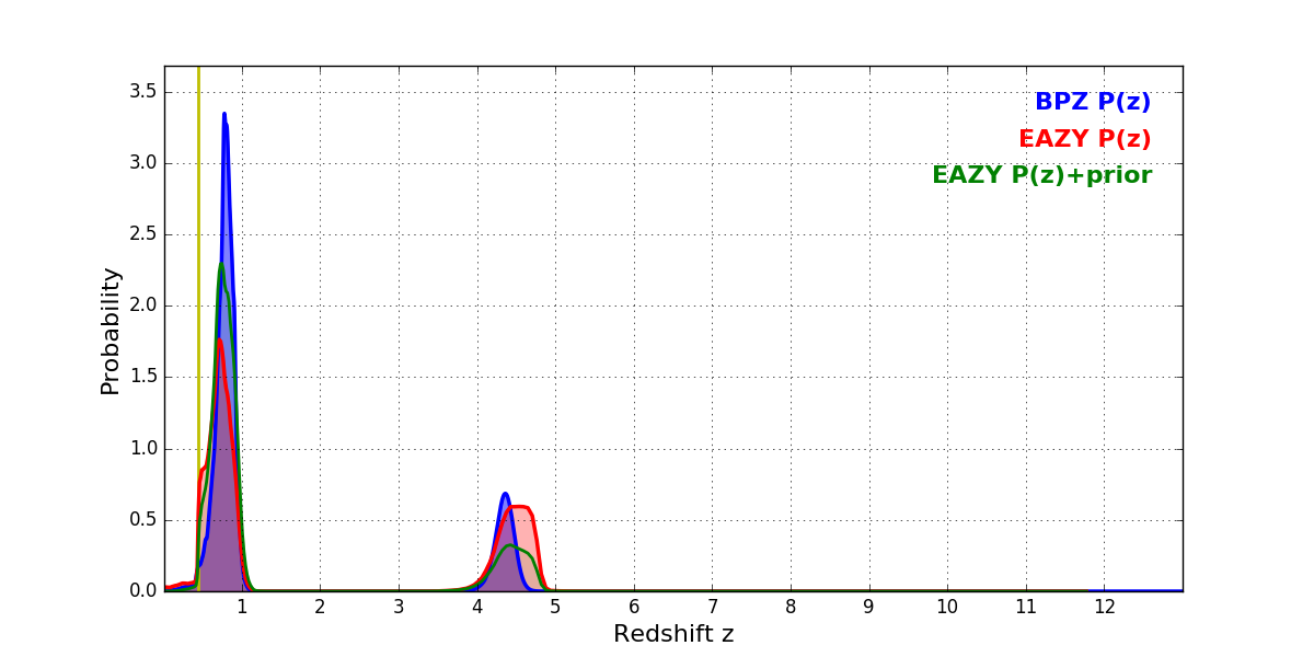 In P(z) plots: Yellow lines mark the cluster redshift z = 0.438,