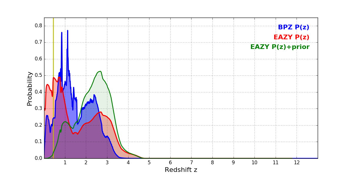 In P(z) plots: Yellow lines mark the cluster redshift z = 0.438,