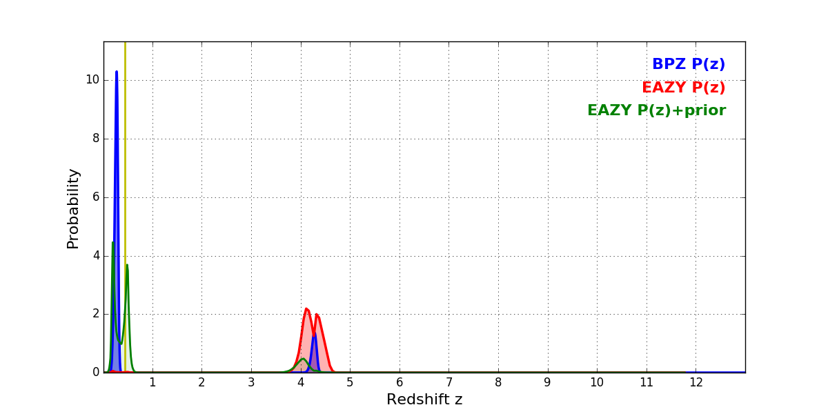 In P(z) plots: Yellow lines mark the cluster redshift z = 0.438,