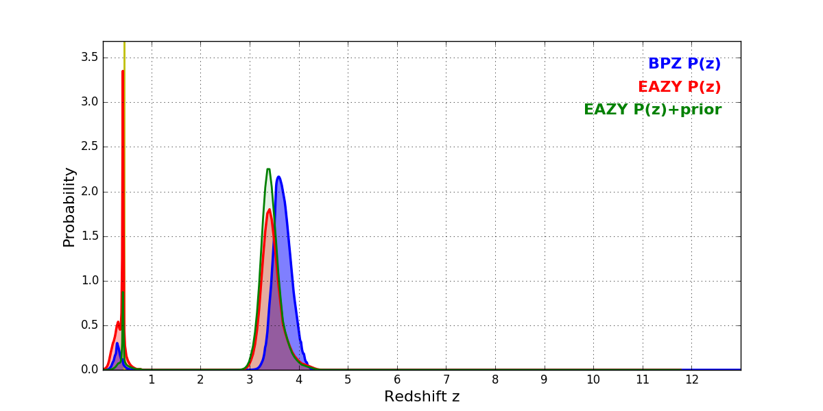 In P(z) plots: Yellow lines mark the cluster redshift z = 0.438,