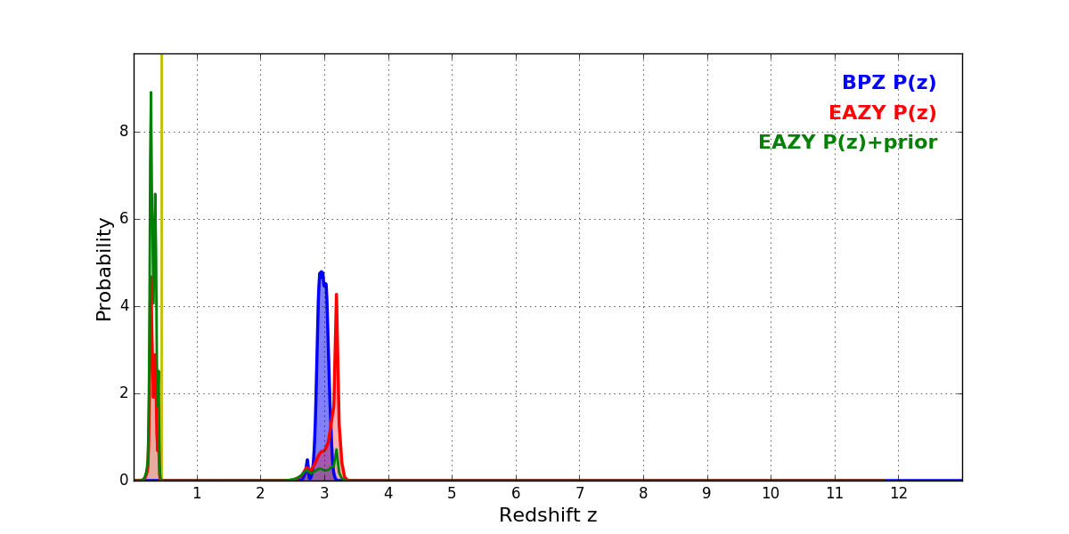 In P(z) plots: Yellow lines mark the cluster redshift z = 0.438,