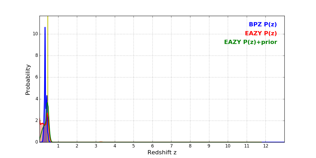 In P(z) plots: Yellow lines mark the cluster redshift z = 0.438,