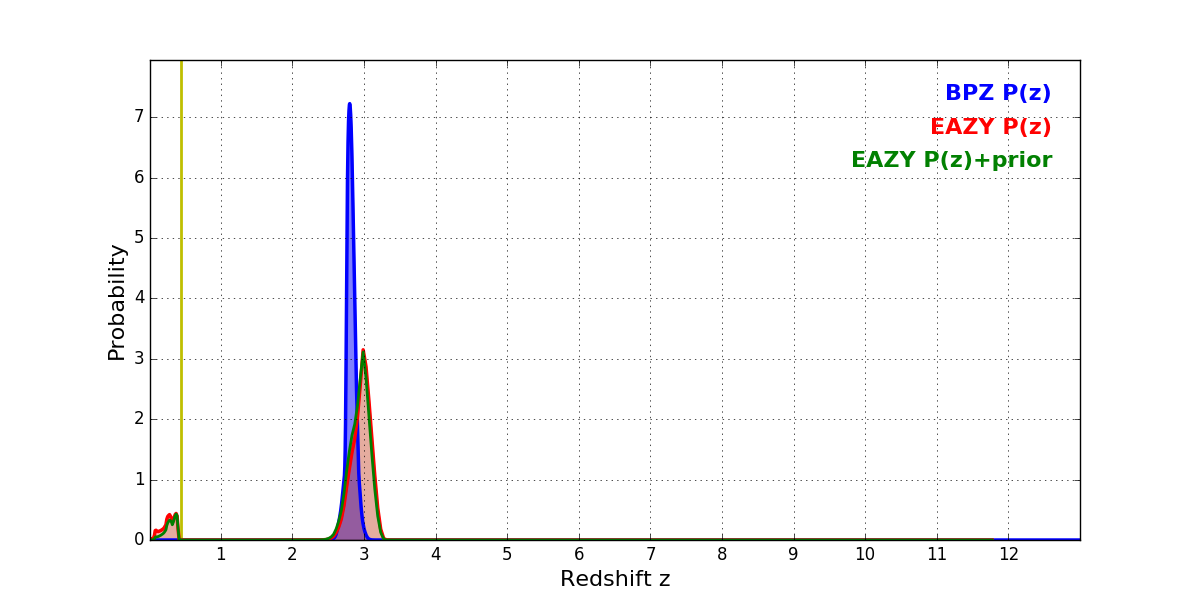 In P(z) plots: Yellow lines mark the cluster redshift z = 0.438,