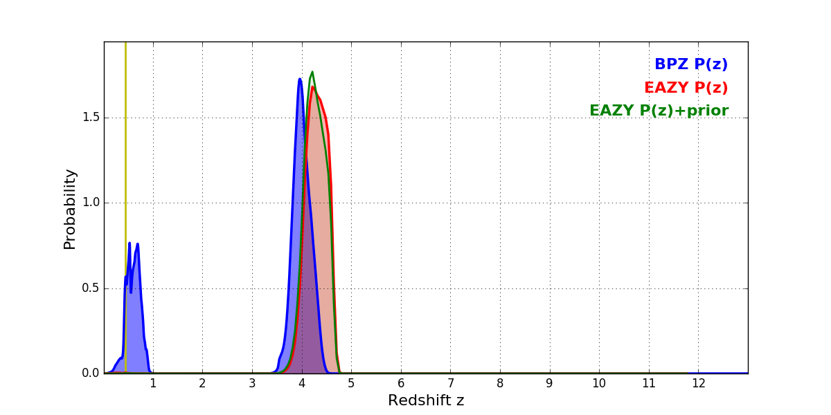 In P(z) plots: Yellow lines mark the cluster redshift z = 0.438,