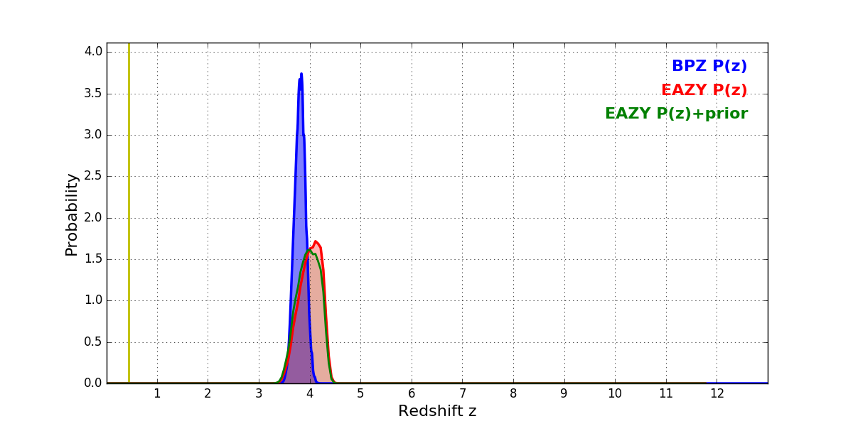 In P(z) plots: Yellow lines mark the cluster redshift z = 0.438,