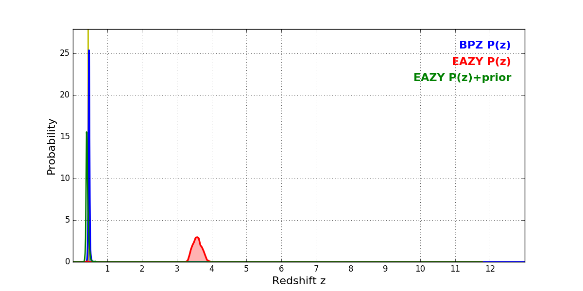 In P(z) plots: Yellow lines mark the cluster redshift z = 0.438,