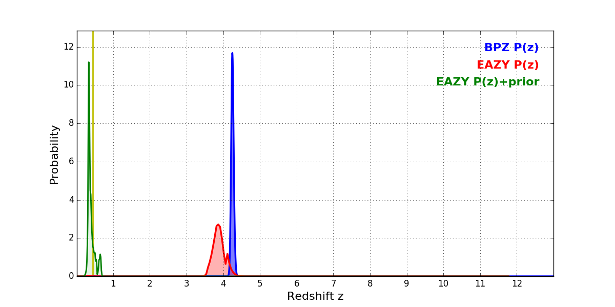 In P(z) plots: Yellow lines mark the cluster redshift z = 0.438,