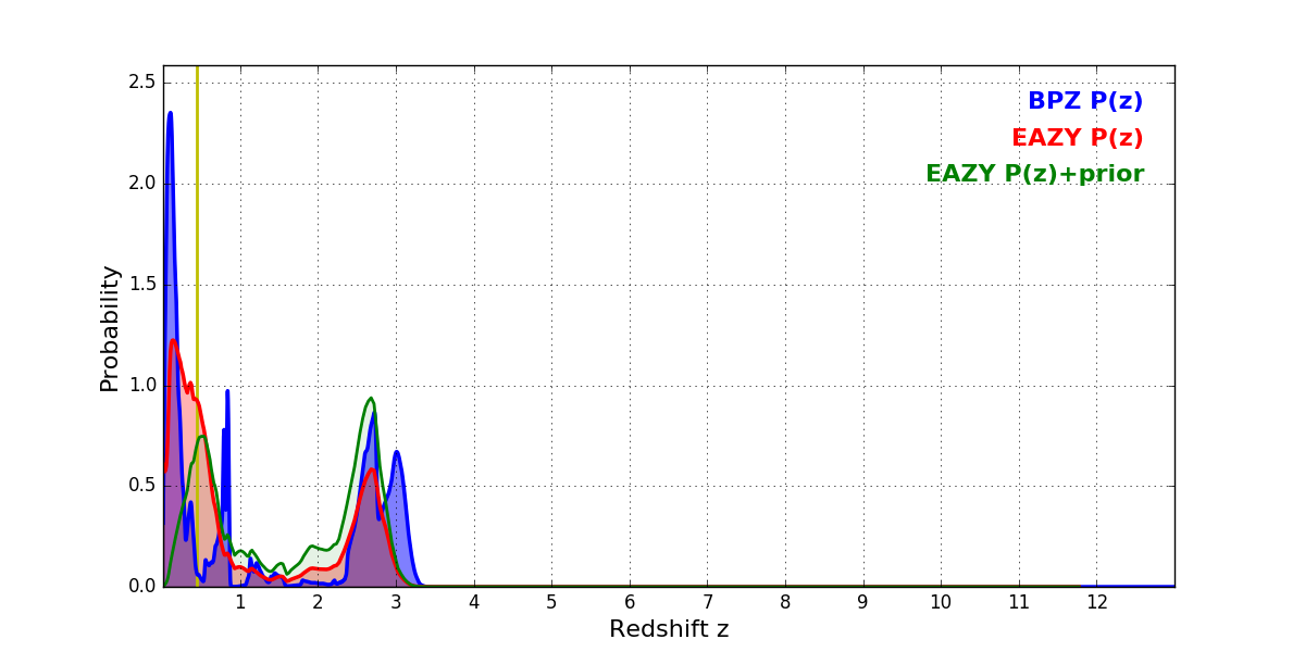 In P(z) plots: Yellow lines mark the cluster redshift z = 0.438,