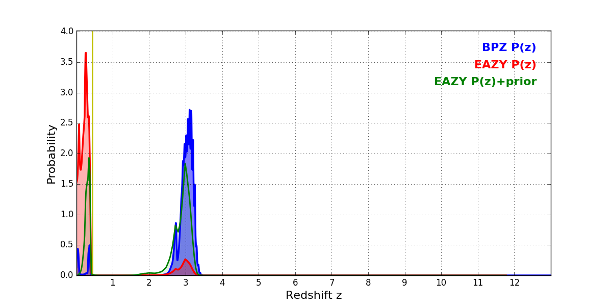In P(z) plots: Yellow lines mark the cluster redshift z = 0.438,