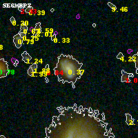 Black segments are analyzed here. Roll mouse over color images to view segments. Best viewed in a wide browser window (1200 pixels or more). Download SED & P(z) plots to view larger versions.