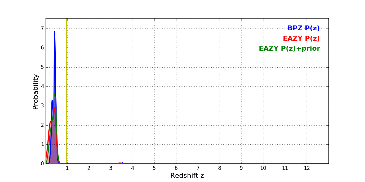 In P(z) plots: Yellow lines mark the cluster redshift z = 0.972,