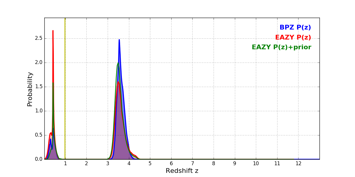 In P(z) plots: Yellow lines mark the cluster redshift z = 0.972,