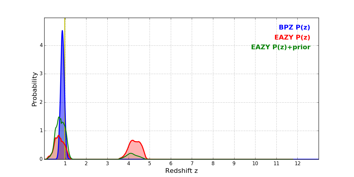 In P(z) plots: Yellow lines mark the cluster redshift z = 0.972,