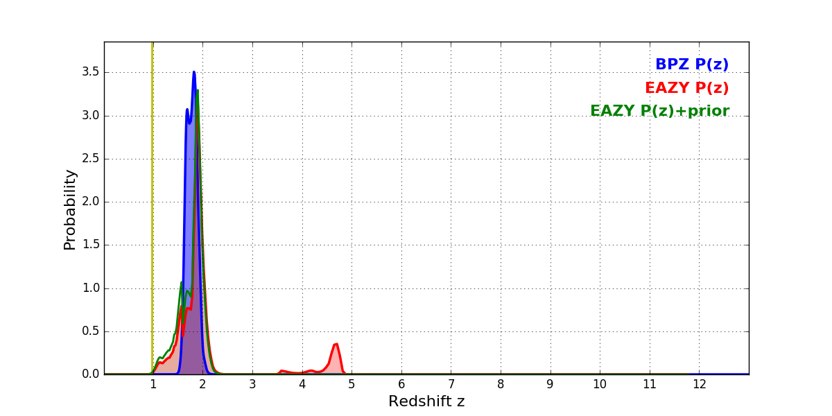 In P(z) plots: Yellow lines mark the cluster redshift z = 0.972,