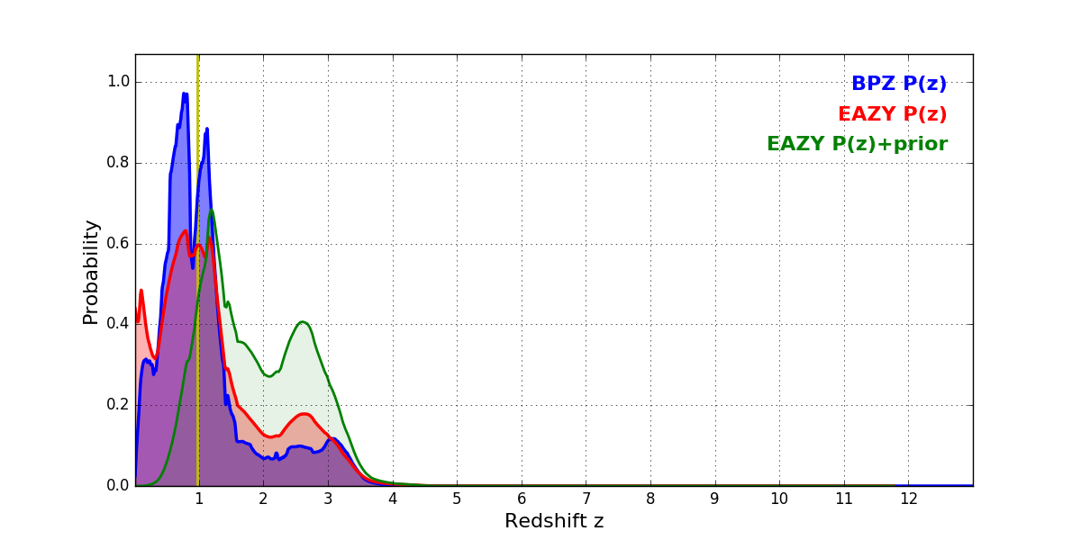In P(z) plots: Yellow lines mark the cluster redshift z = 0.972,