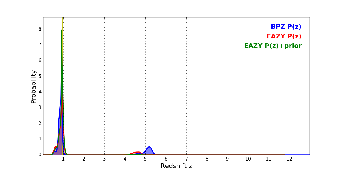 In P(z) plots: Yellow lines mark the cluster redshift z = 0.972,