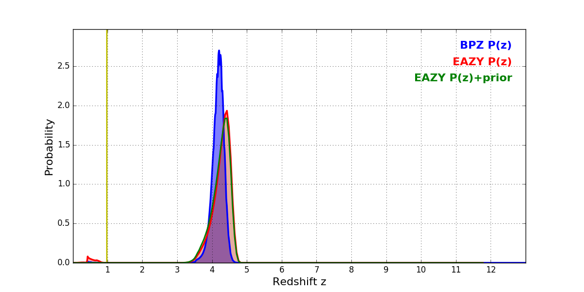 In P(z) plots: Yellow lines mark the cluster redshift z = 0.972,