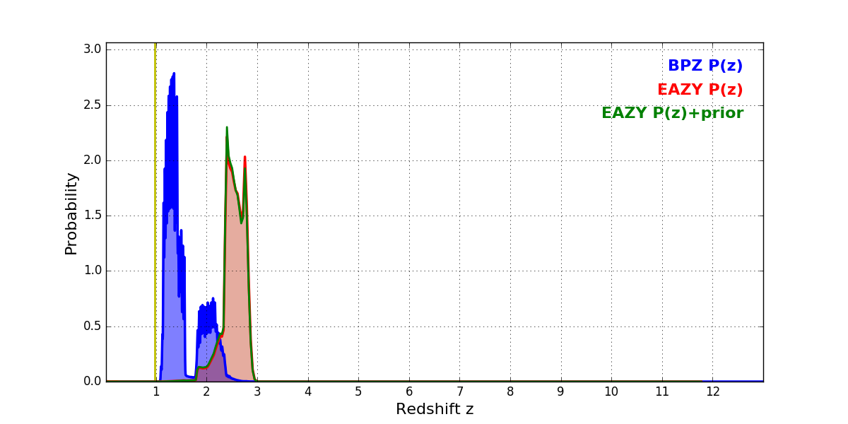 In P(z) plots: Yellow lines mark the cluster redshift z = 0.972,