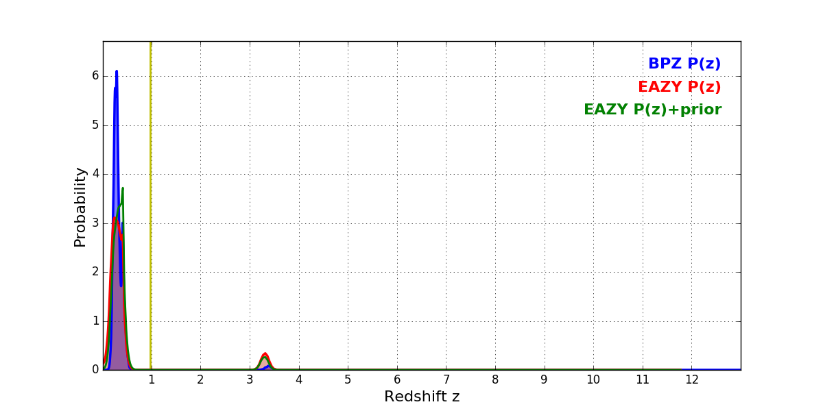 In P(z) plots: Yellow lines mark the cluster redshift z = 0.972,
