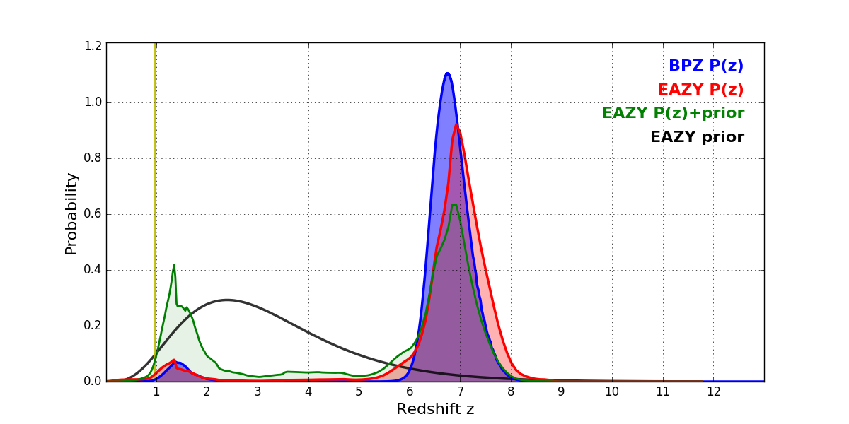 In P(z) plots: Yellow lines mark the cluster redshift z = 0.972,