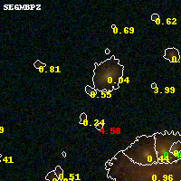 Object #391   x,y = (2297, 2770)   RA, Dec = (01:37:25.944, -8:27:05.40) = (24.35810, -8.45150)   BPZ = 0.551 [0.107--0.756]   type = 10.10 (SB3_B10 - SB11_A_0_l)   chisq2 = 0.70   ODDS = 0.38   z_cluster = 0.566