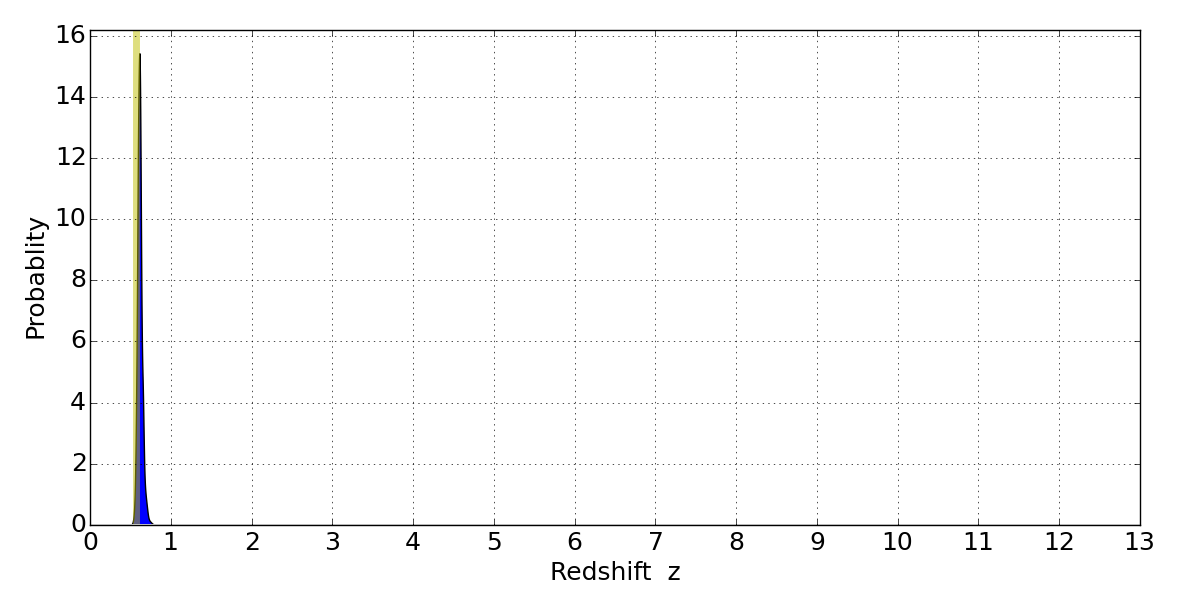 In P(z) plots: Yellow lines mark the cluster redshift z = 0.566,