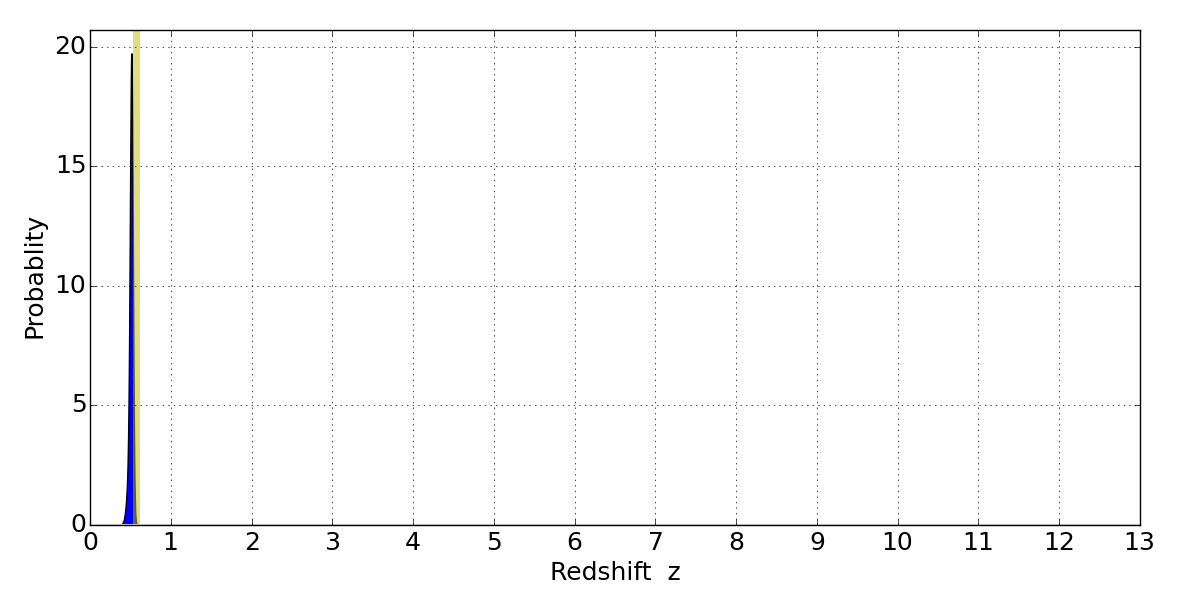 In P(z) plots: Yellow lines mark the cluster redshift z = 0.566,