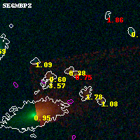Object #1642 x,y = (1373, 3513) RA, Dec = (01:37:29.664, -8:26:20.76) = (24.37360, -8.43910) BPZ = 0.380 [0.128--3.370] type = 9.40 (SB2_B10 - SB3_B10) chisq2 = 0.48 ODDS = 0.10 z_cluster = 0.566